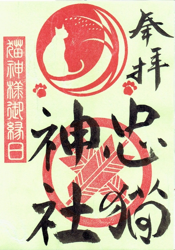 神社名(忠猫神社)の上には【神紋】、左上には【猫神様御縁日】の朱印が押してあります。