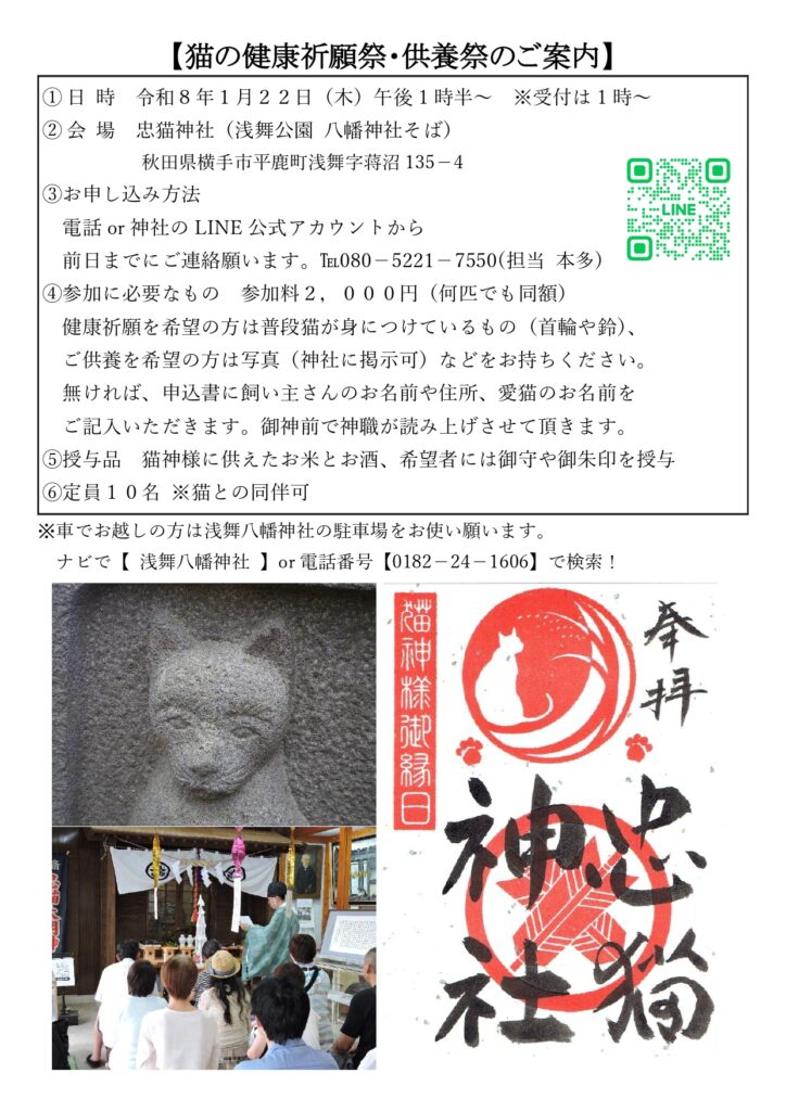 毎月22日(にゃんにゃん)は忠猫神社の縁日であり、猫の健康祈願祭並びに供養祭を実施しています。