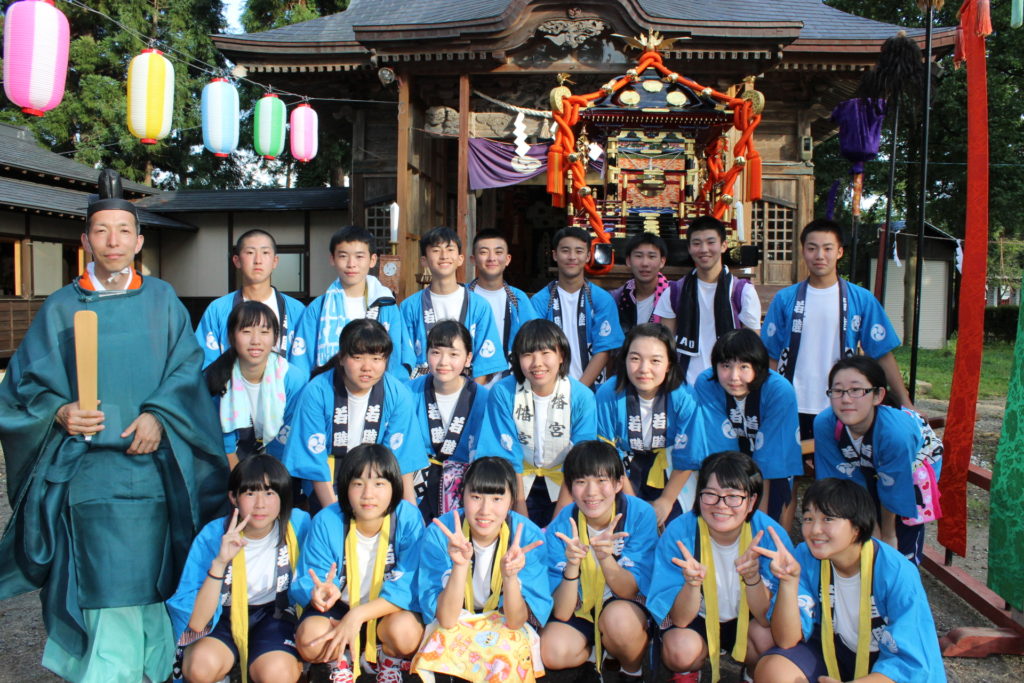 以下は神輿が神社に戻って来てから撮影した記念写真です。毎年、地元平鹿中学の生徒の皆さんにご奉仕していただいています。