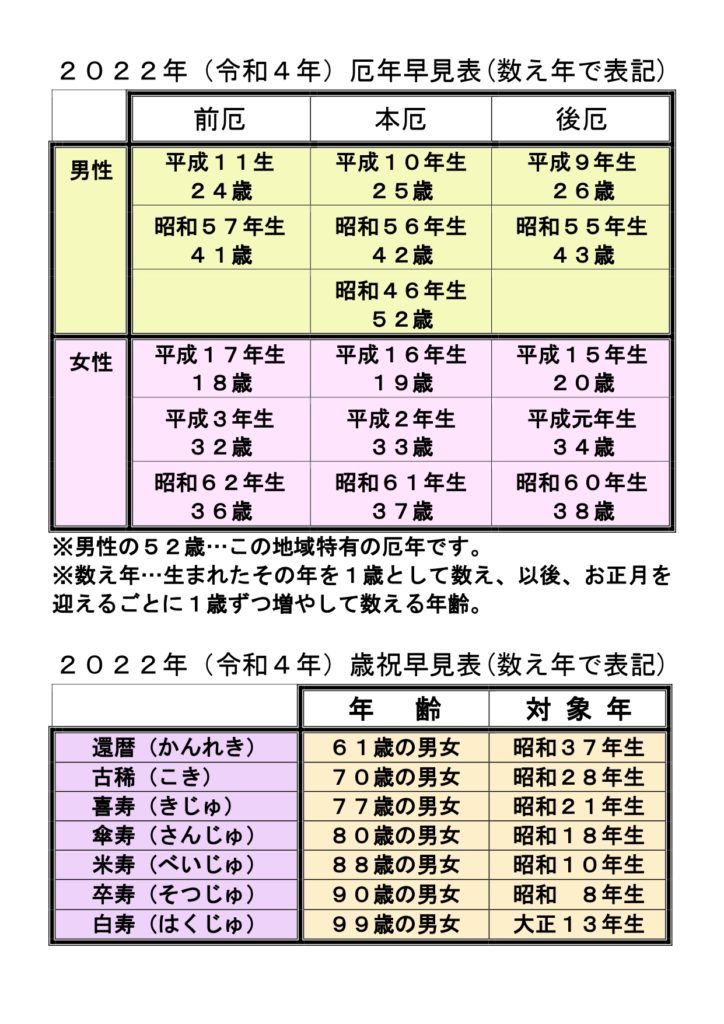 以下は今年の厄年・歳祝早見表です。