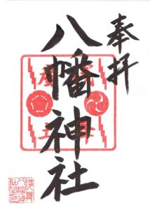 右側の神紋(神社の紋章)は「左三つ巴紋」であり、別名「武将紋」と言われ、八幡大神(武の神)にゆかりの深いもの です。諸説ありますが、弓で矢を射る際、矢が放たれた後に弦が腕に当たって怪我をする場合があるそうです。